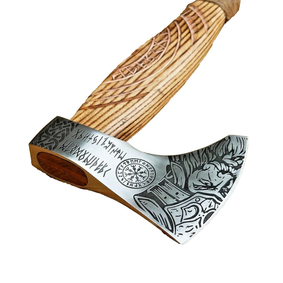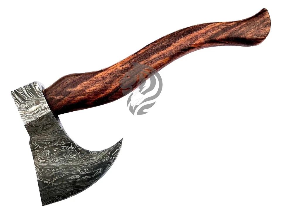 Hoja de Damasco forjada hecha a mano HUNTEX, madera de fresno magníficamente tallada a mano Tomahawk